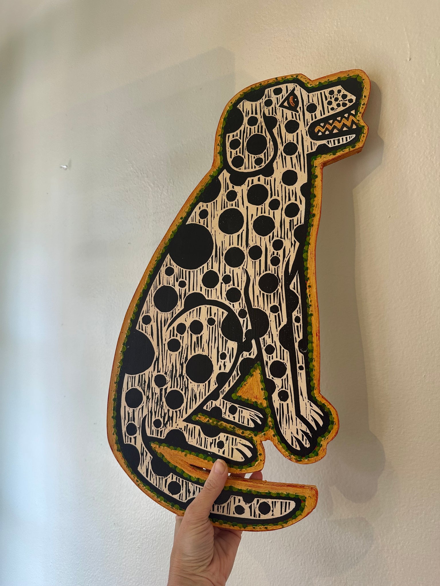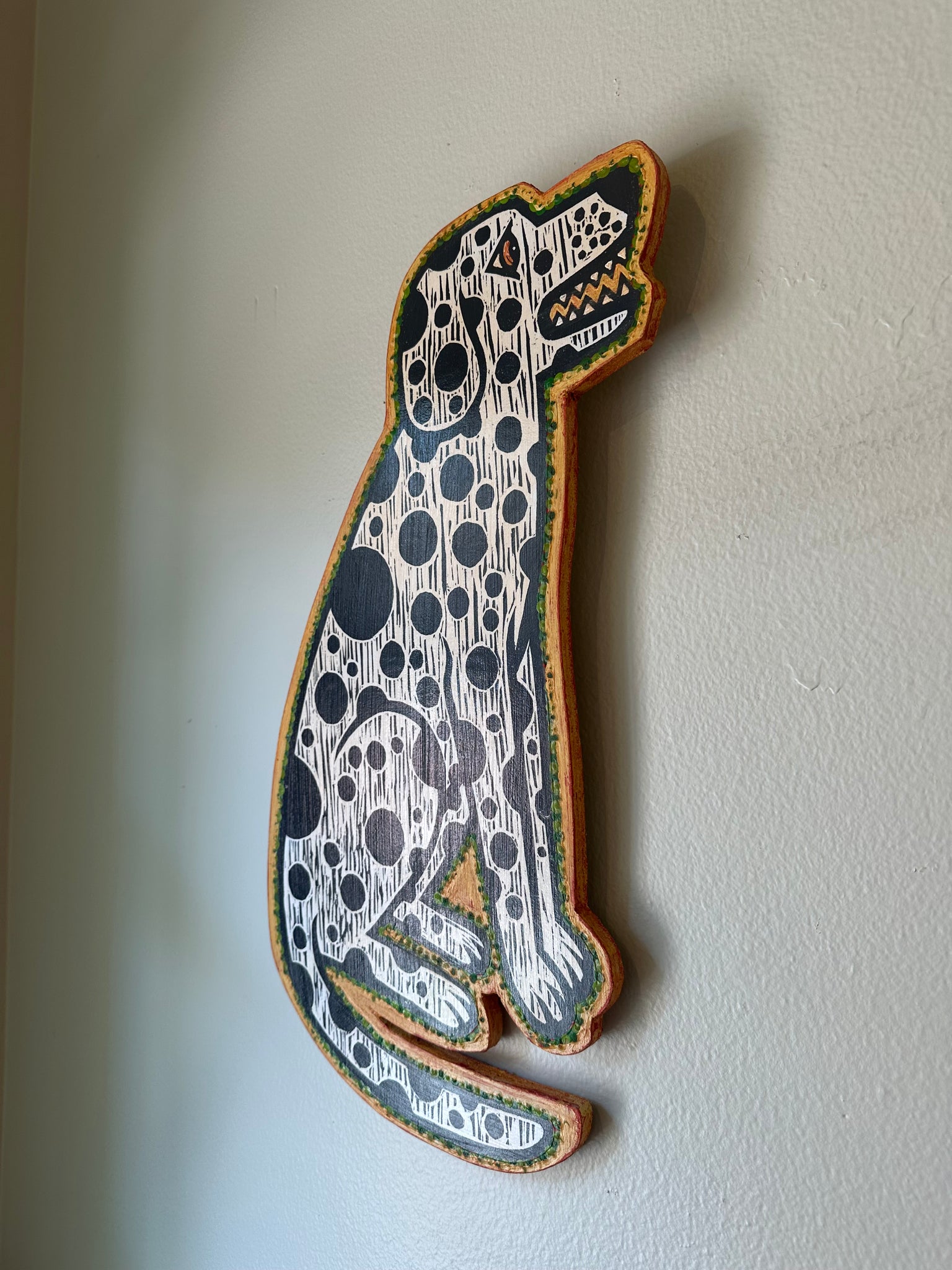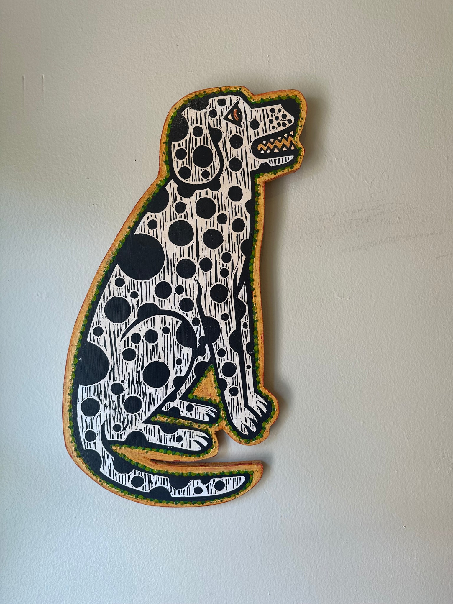 Hand carved, hand printed spotted dog woodcut - printed on paper and mounted to wood, painted with acrylic paint. Ready to hang with wire on back. Printed in black and white and border painted with bright yellow and green acrylic paint making this doggo really pop!