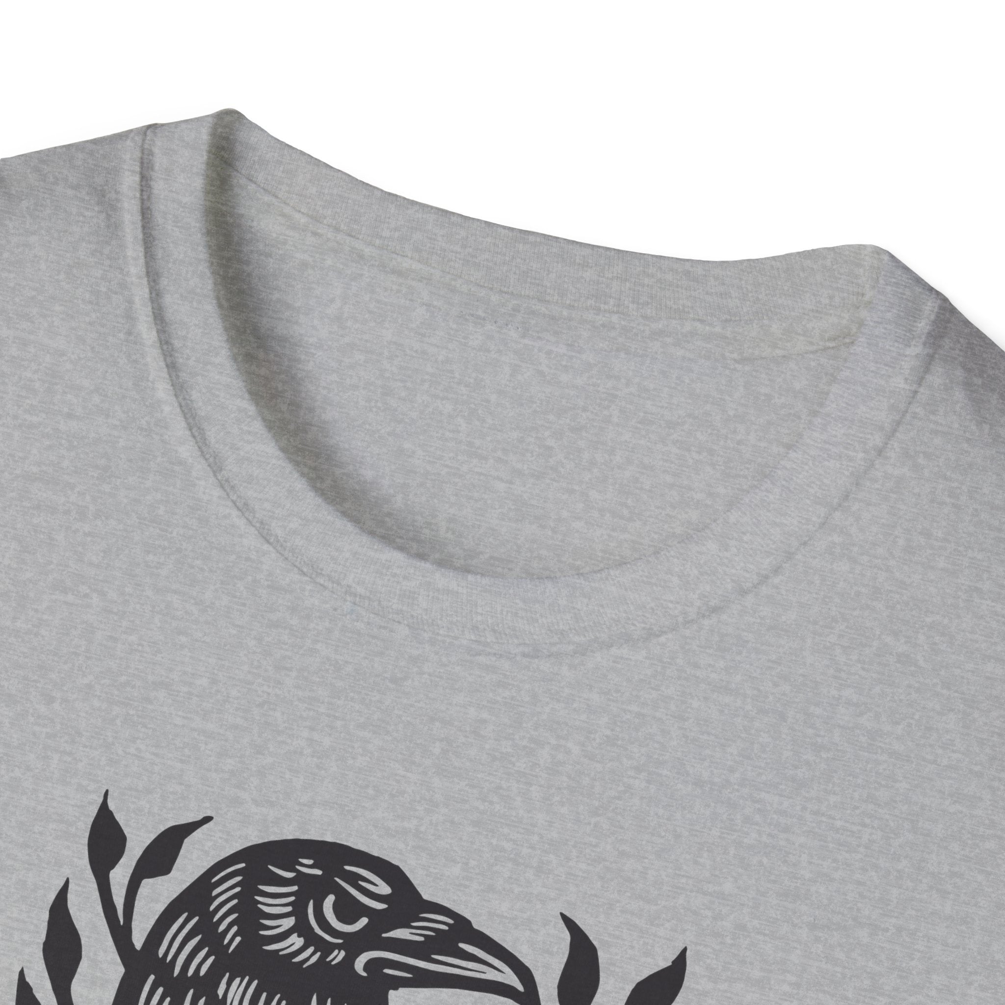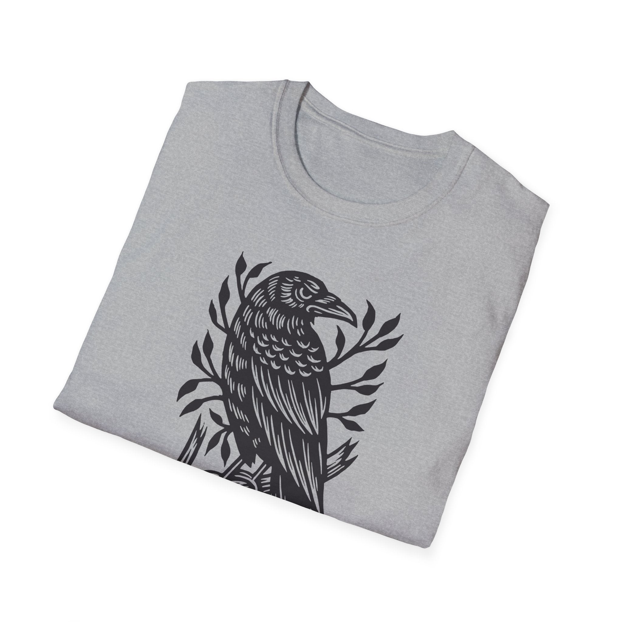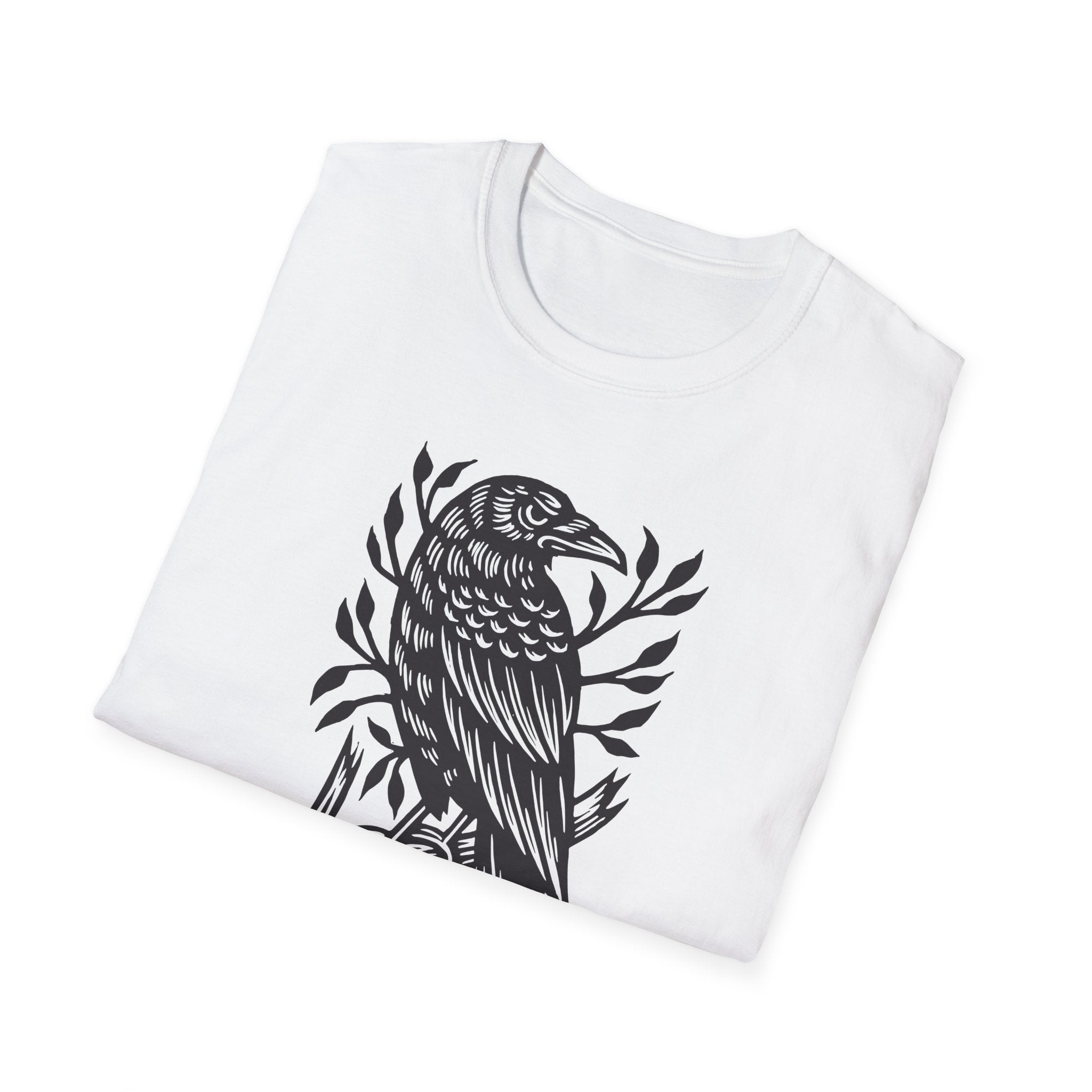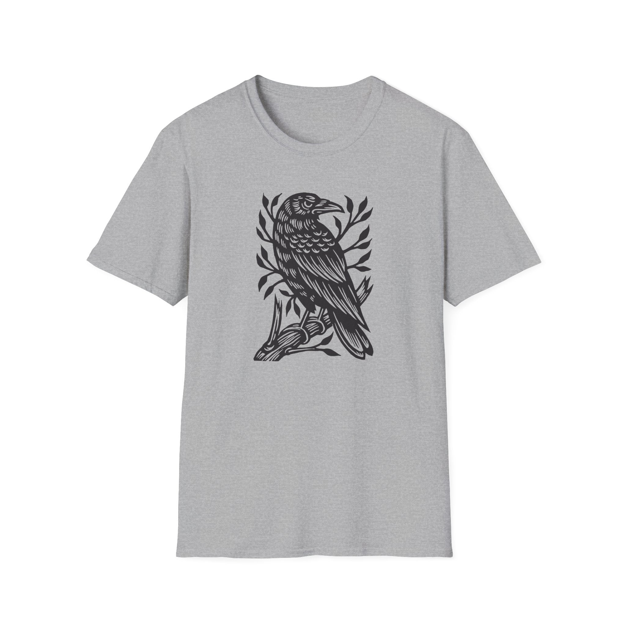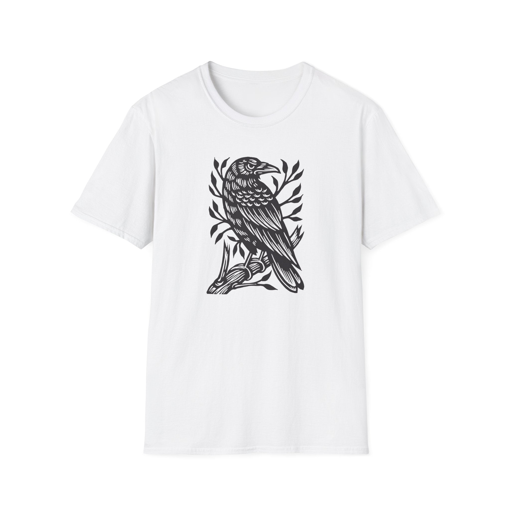 Perched Raven Linocut Graphic Artwork on Gildan Unisex Softstyle T-Shirt